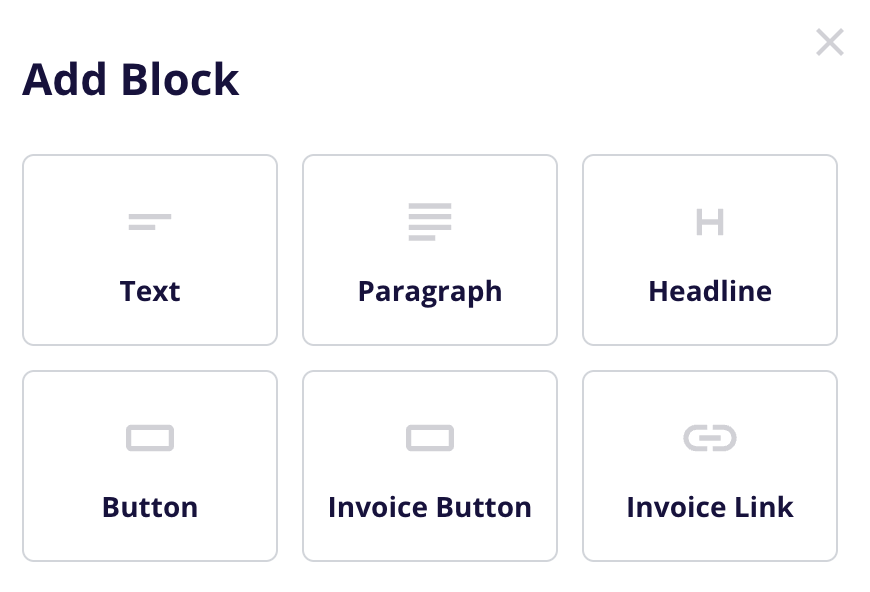 Simply click the “Add Block” button and select either the headline, paragraph, text, button, invoice button, or invoice link.