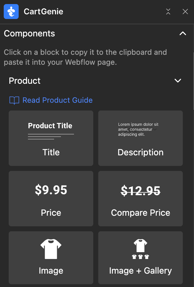 In Webflow, click on the App tab in the left menu and select “CartGenie.” Then go to Create Product Pages > Components > Product section.