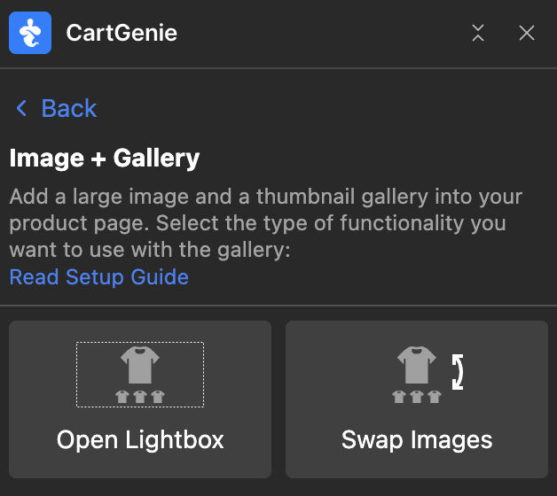 CartGenie makes it easy to add in a gallery of thumbnails underneath your main product images.