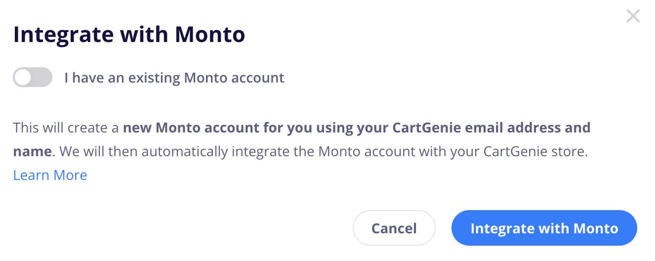 This will create a new Monto account for you using your current CartGenie email address and name. We will then automatically integrate the Monto account with your CartGenie store.