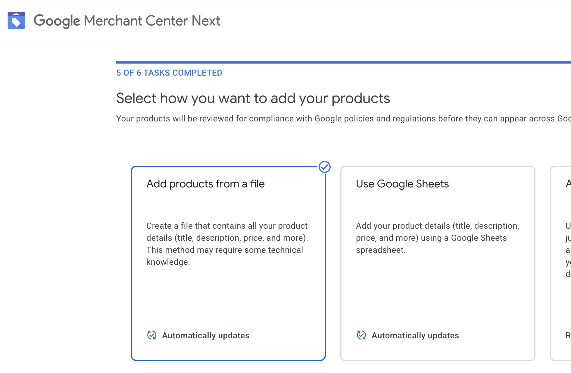 Create a primary feed in Products → Feeds → + → Add primary feed.