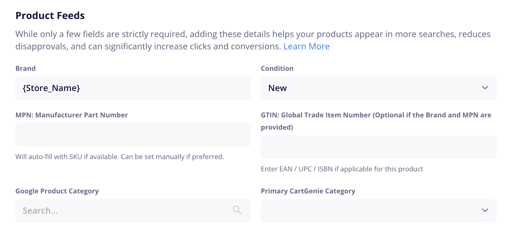 In each CartGenie product, go to the “Additional Info” tab and fill out the fields for “Product Feeds”.