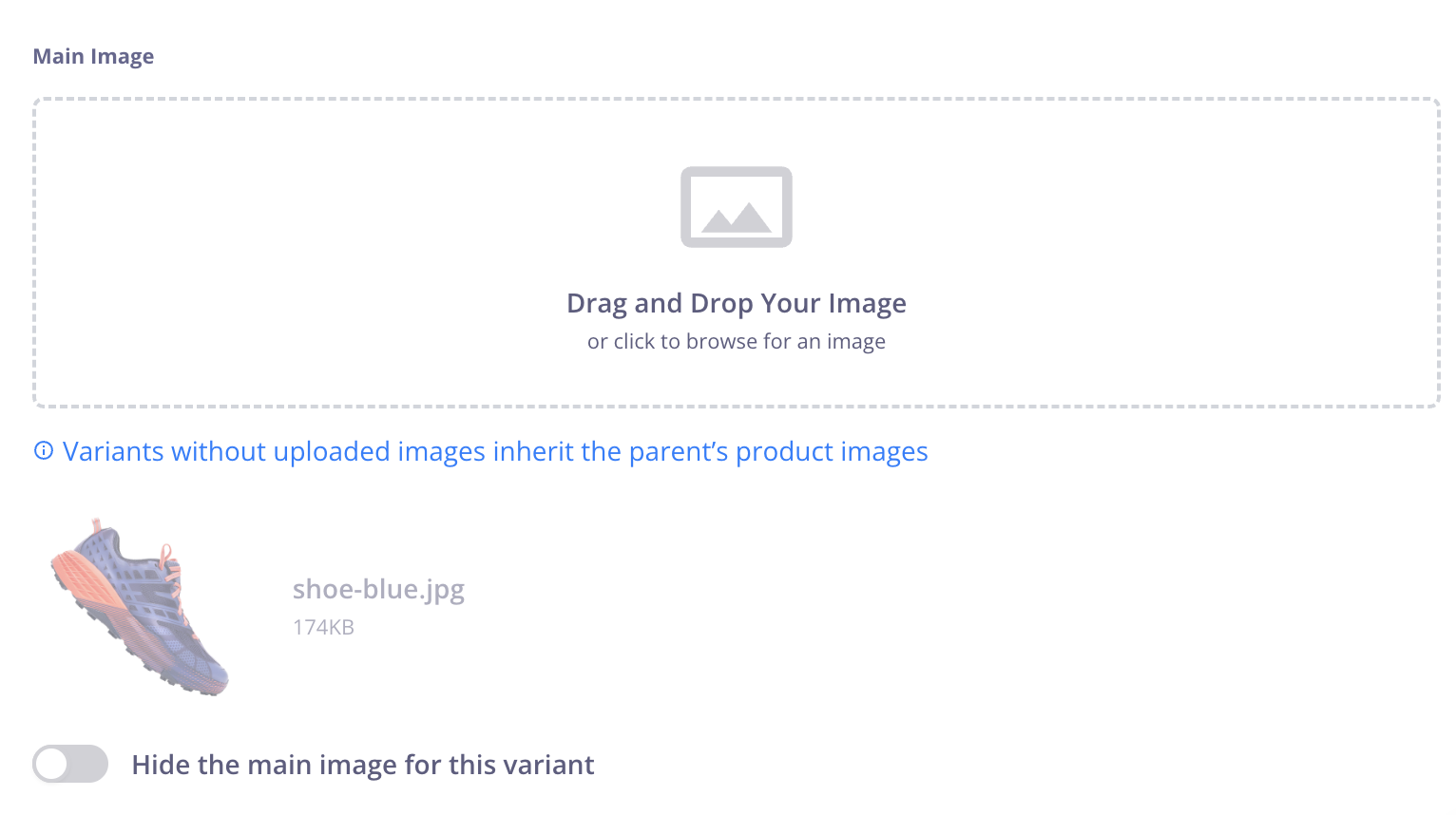 You also have two toggles to Hide the main image for this variant and a toggle to Hide all extra images for this variant. If any of these are enabled, it will hide that image from the front-end of your site.