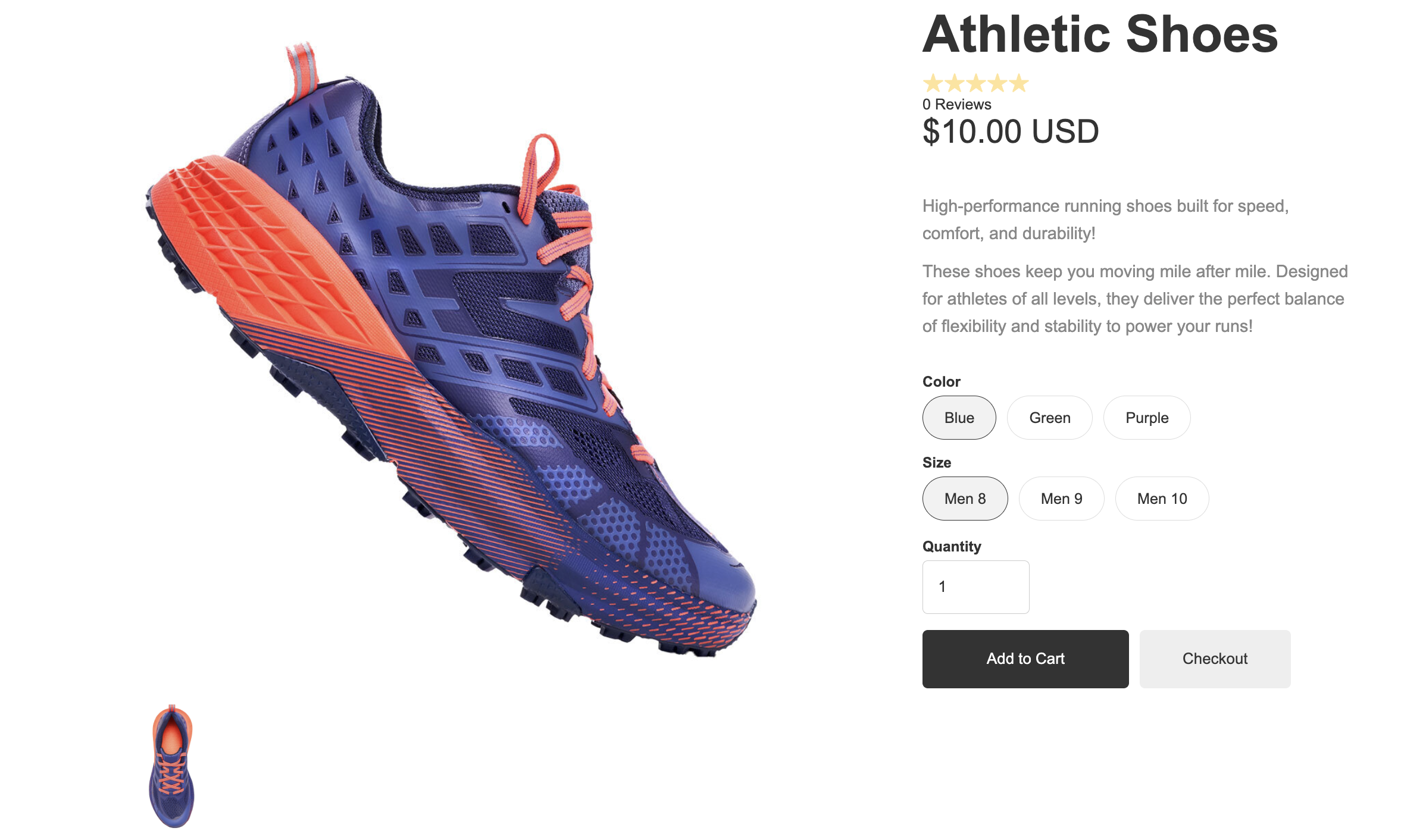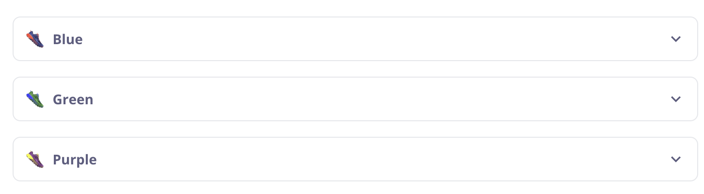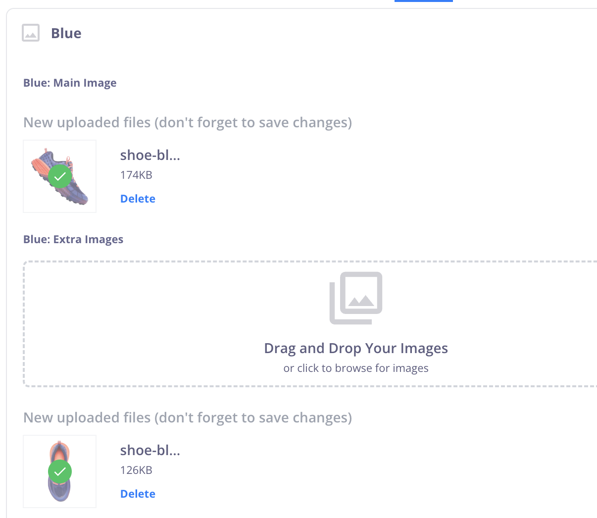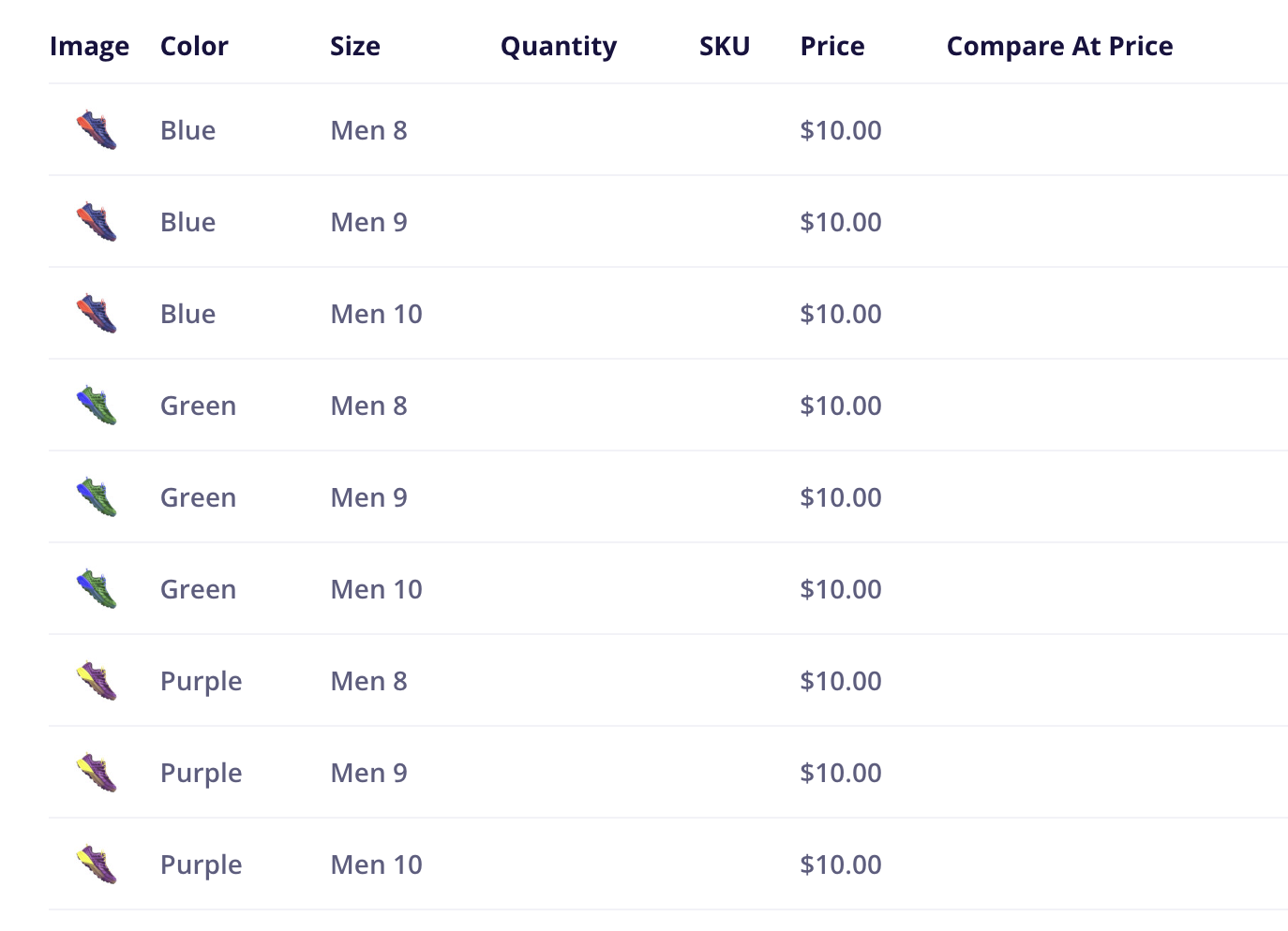If you enable the Smart Uploader on your color set, you can upload a unique image for blue, green, and purple and it will be applied to all variants with these values. So for example… the Blue / Men 8, Blue / Men 9 and Blue / Men 10 variants will all contain the blue image.