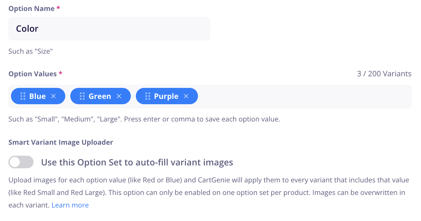 When creating or editing an option set in CartGenie, you will see a toggle called “Smart Variant Image Uploader”. Enabling this toggle will allow you to use this option set to auto-fill variant images.