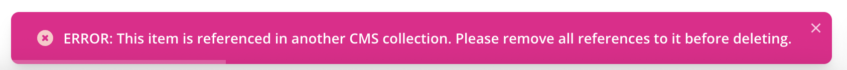 If you’ve tried to delete a product or category in CartGenie and see this error: “ERROR: This item is referenced in another CMS collection. Please remove all references to it before deleting” then here is what you need to know.