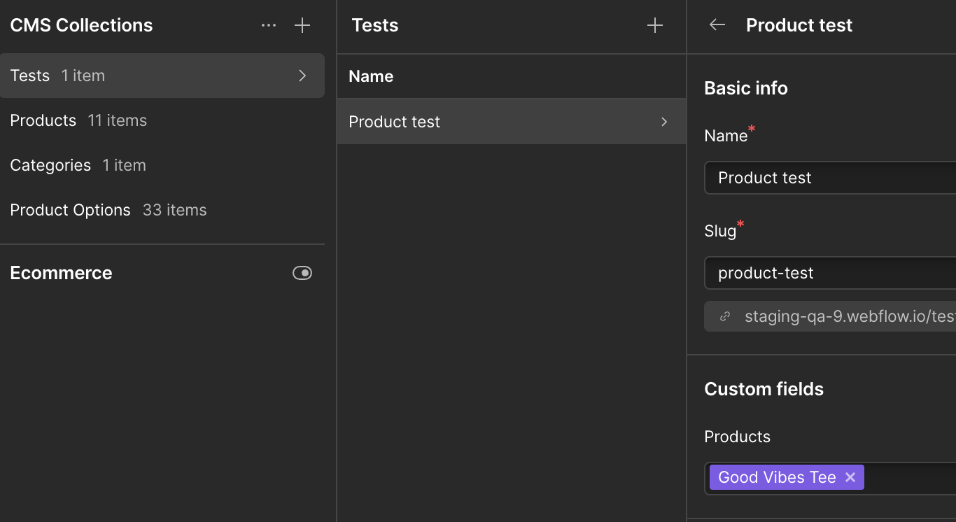 Example: This collection is referencing my “Good Vibes Tee”. All I need to do is click the ‘x’ next to my product name in the reference field and then publish that collection item.