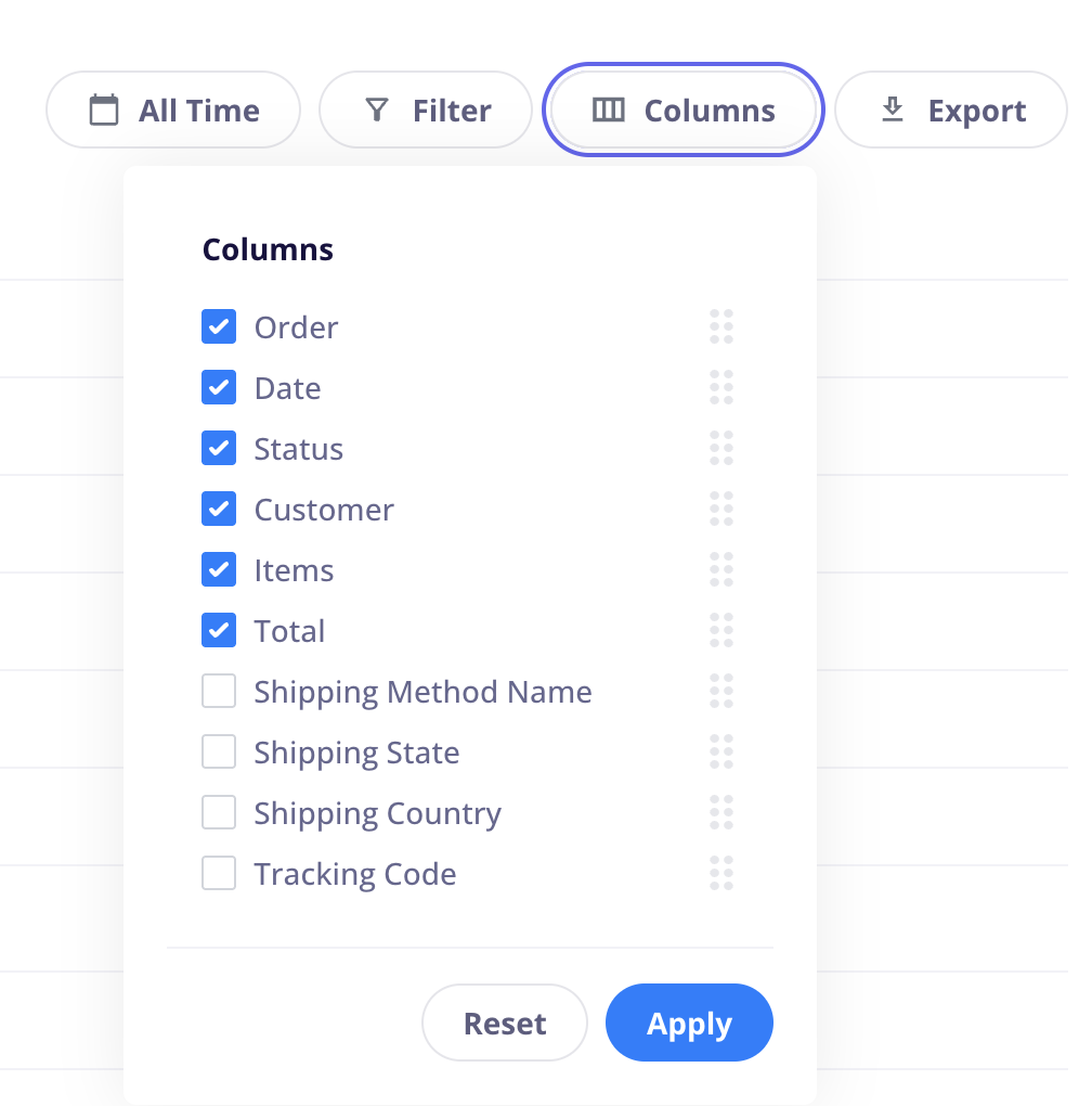 On any list page in CartGenie, click on the “Columns” button in the top right of the page.