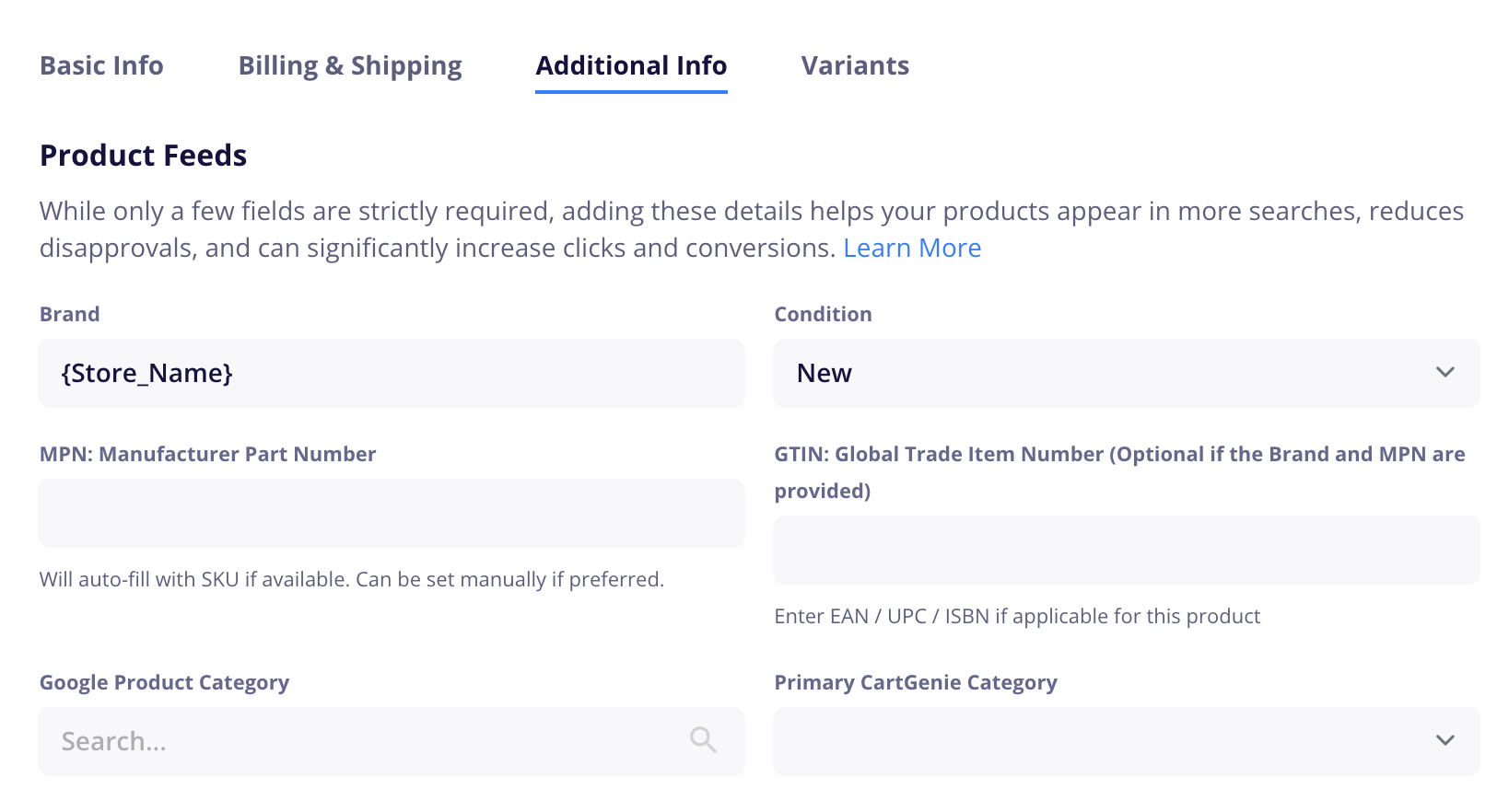 In order to improve the Google / Meta listings of your products, we recommend filling out all information in the Product Feeds section such as the Google category, GTIN / MPN, etc.