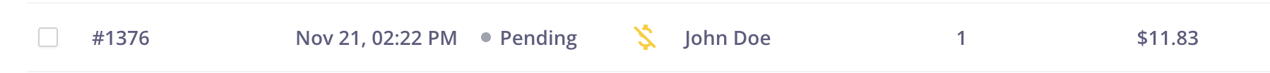 These unpaid orders will display a yellow dollar sign with a line through it, indicating that the order has not been paid yet. Depending on your store’s order flow, you likely will not want to fulfill this order until you receive payment.