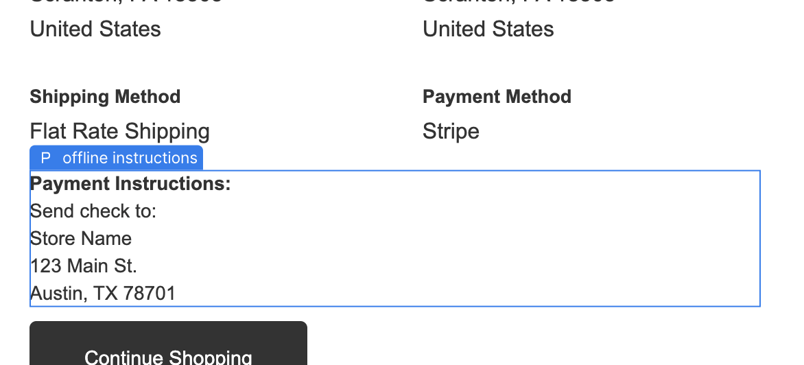 The Order Confirmed (Offline Payment) email is where the instructions you added back in Step 1 will be displayed to the customer. This is useful in case they closed out of the confirmation page before following instructions to send the payment.