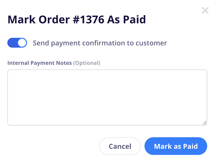 If you click into an unpaid order, you will see the option to “Mark as Paid”.