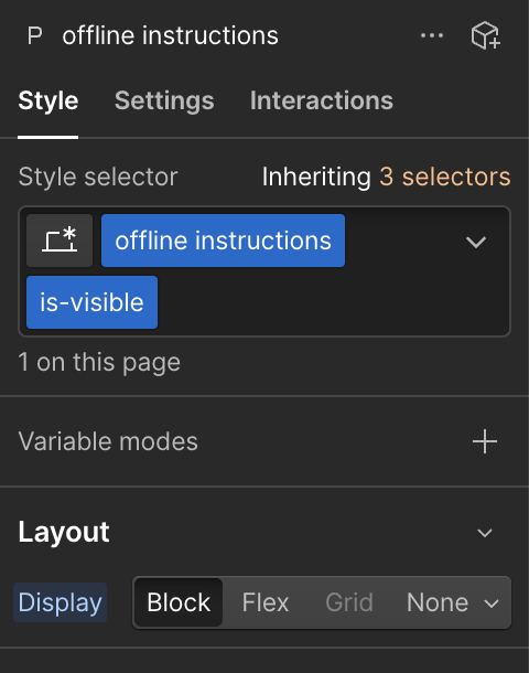 Then add another class to it called “is-visible”. Set display to “Block” with this is-visible class.