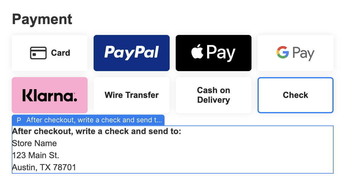 CartGenie will automatically display this block if your customer uses that specific offline method only.