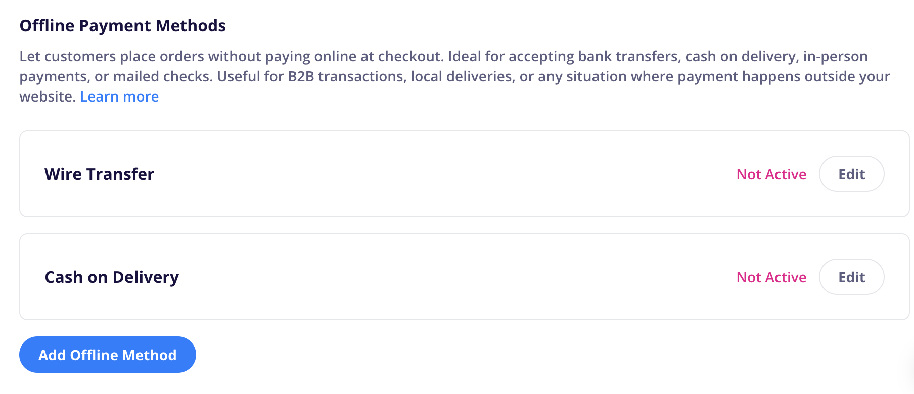 Scroll down to the offline payment methods section and you should see 2 methods that we’ve already created for you: wire transfer & cash on delivery. Both will be disabled by default, but you can enable them if you would like to use them. Then follow steps 2+ to ensure they are set up to your preferences.
