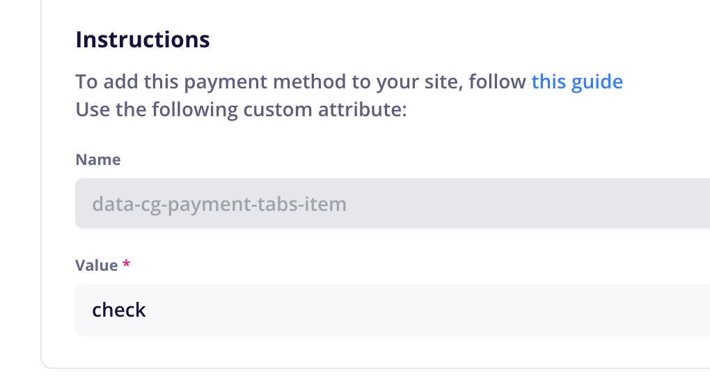 [your custom value]The value should be the same custom value you added in the offline payment settings earlier in CartGenie and on your checkout tabs (ex: “check” in my example above)