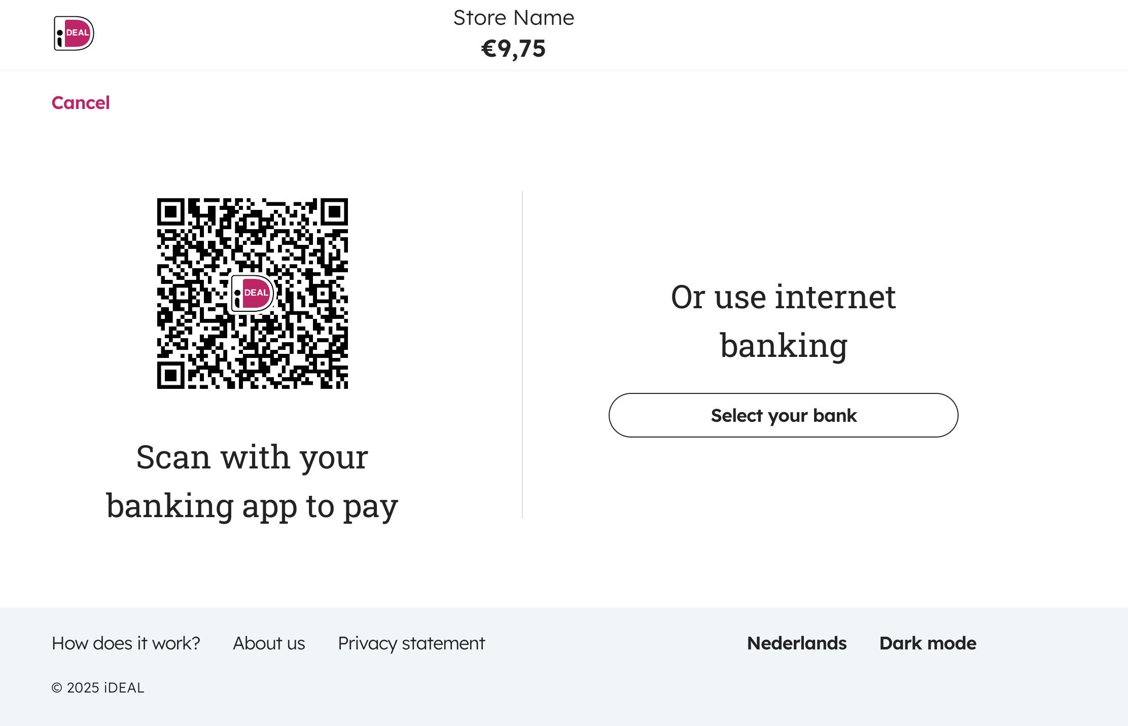 When users select iDeal at checkout, they will be redirected to the site to complete their payment.