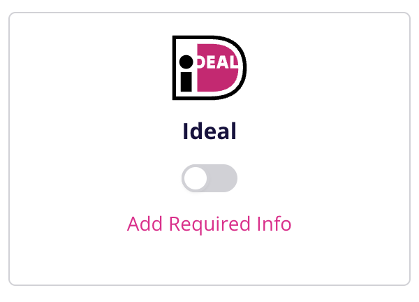 If you see pink text that says “Add Required Info”, then click on it and you will be redirected to Stripe. Find the iDeal payment method and click on the button beside to enter the missing info.