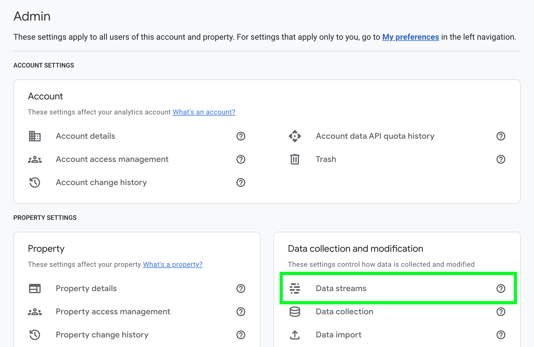 In the Property column, click Data Streams (under "Data collection and modification").