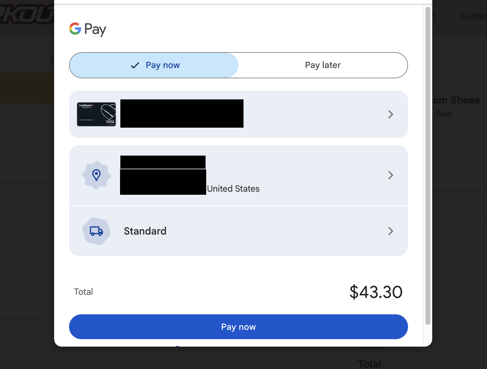 When a customer taps the Google Pay express button on a qualifying order, they'll see a popup with either “Pay Now” or “Pay Later” tabs.