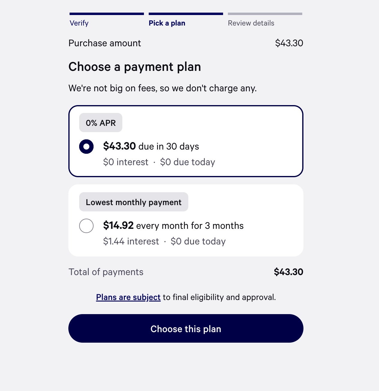 Affirm offers two types of plans. Which options a customer sees depends on the order amount, the customer's creditworthiness, and Affirm's own underwriting criteria.