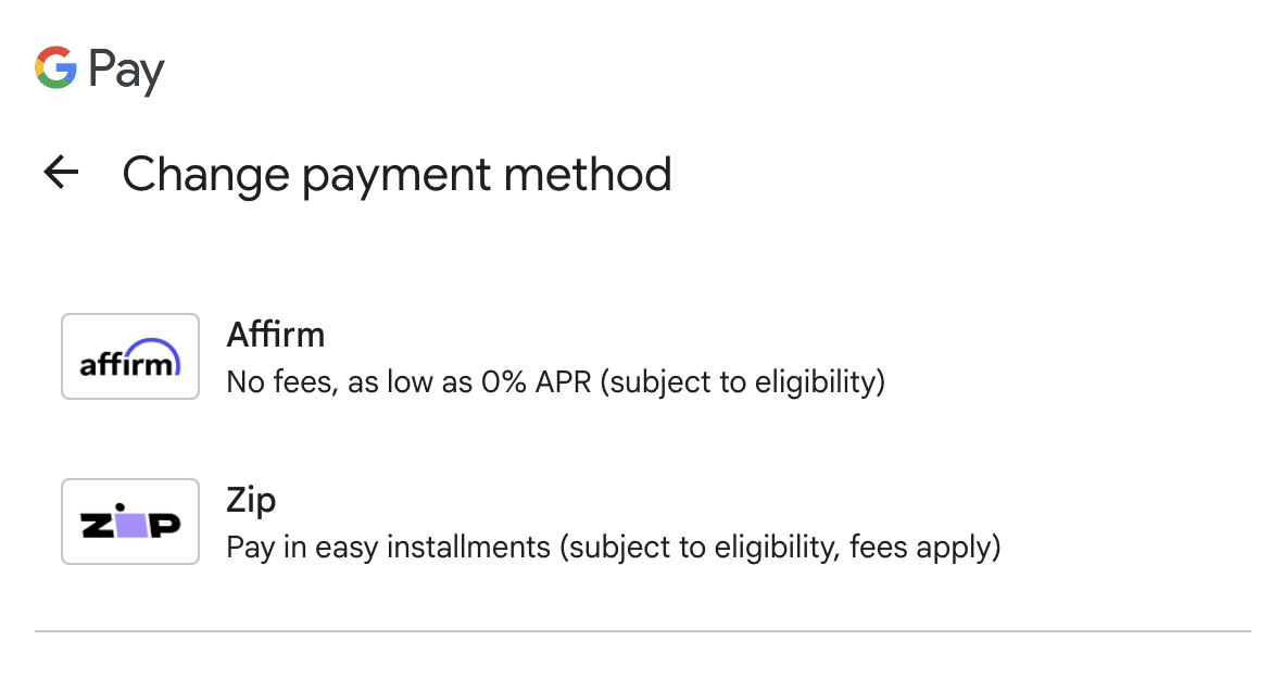 Can I choose which BNPL providers appear at checkout? No. Google Pay controls which providers are shown based on the customer's eligibility and the order details. You cannot limit or select specific BNPL providers. If you wish to not offer Zip as an option, you can remove the Google Pay button from the express payment component or remove the component entirely.