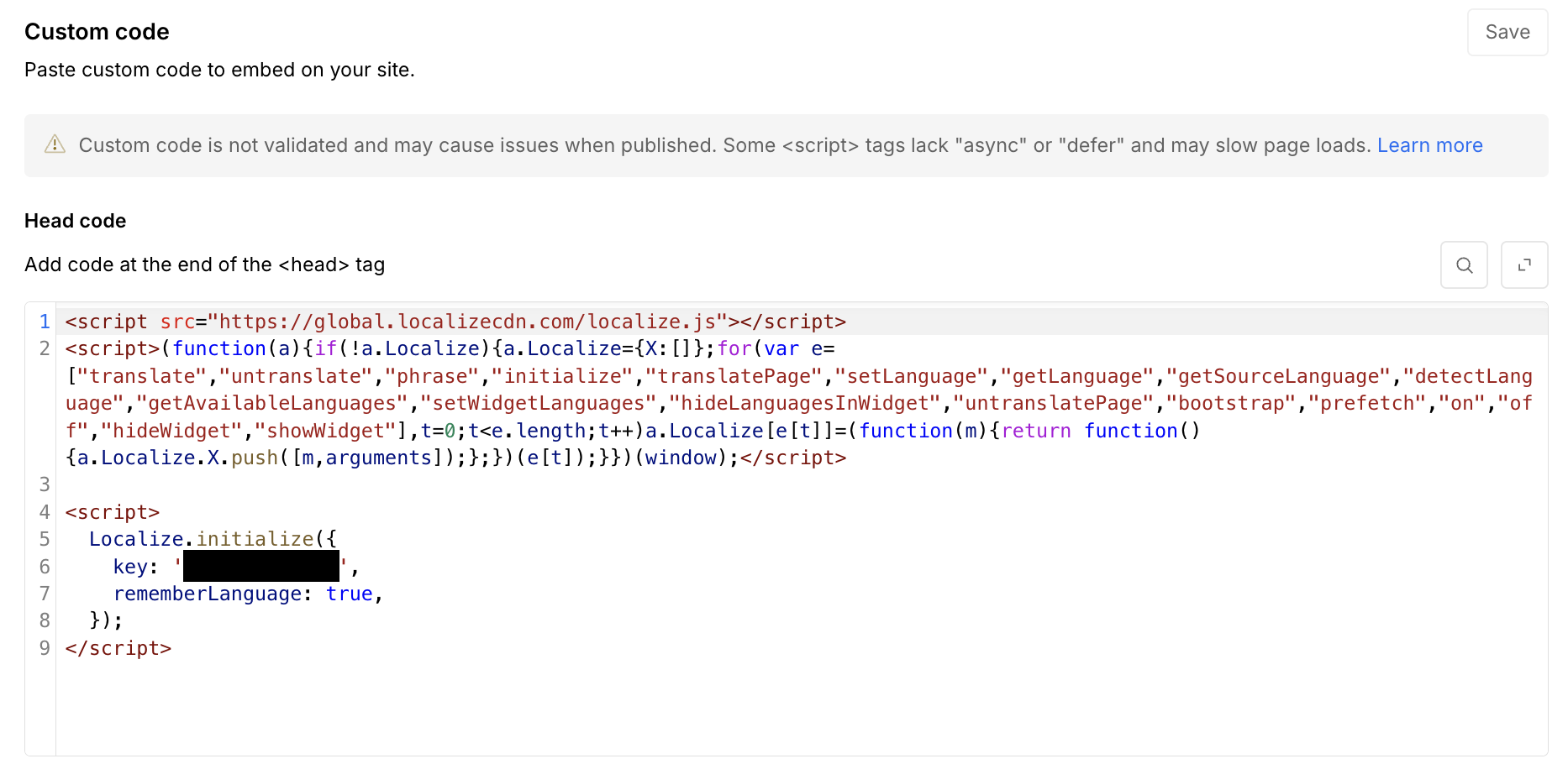 Paste the Localize snippet into the Head Code section. It should be the full snippet Localize provides, including the Localize.initialize({ key: '...' }) block.