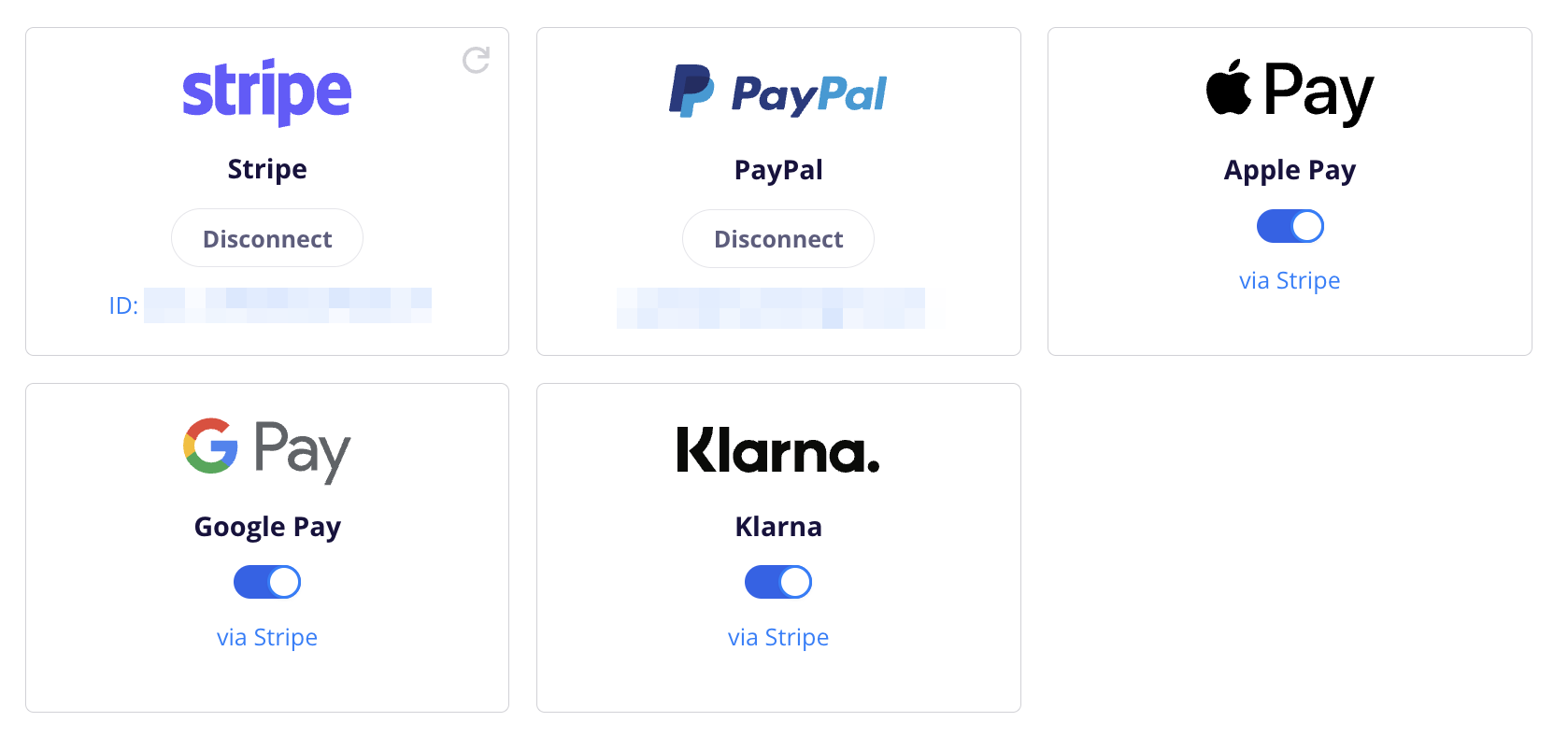 You will also see all other Stripe enabled payment gateways in CartGenie (such as Apple Pay, Google Pay, and Klarna) with a toggle to enable / disable them as you wish.